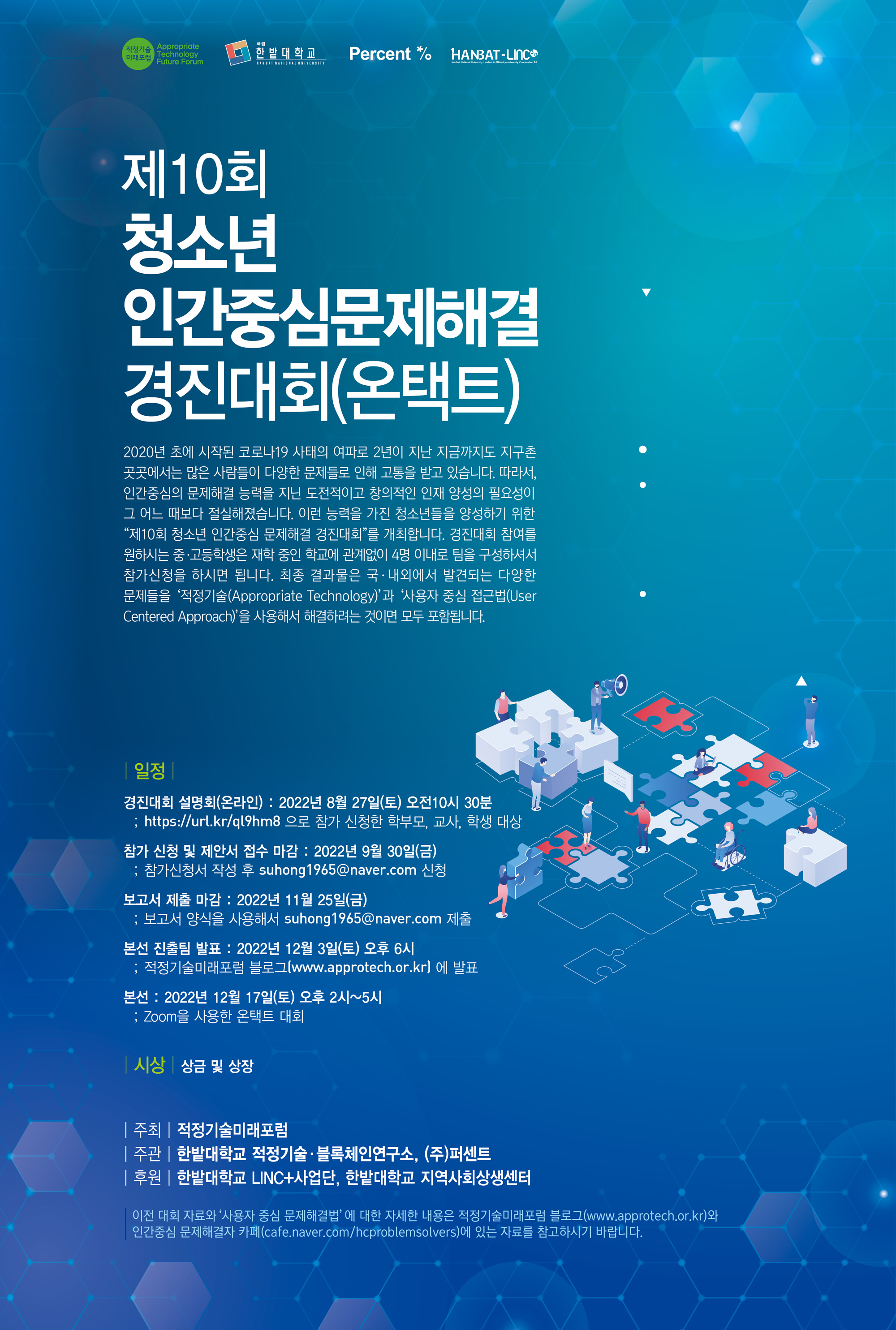 2020년 초에 시작된 코로나19 사태의 여파로 2년이 지난 지금까지도 지구촌 곳곳에서는 많은 사람들이 다양한 문제들로 인해 고통을 받고 있습니다. 따라서, 인간중심의 문제해결 능력을 지닌 도전적이고 창의적인 인재 양성의 필요성이 그 어느 때보다 절실해졌습니다. 이런 능력을 가진 청소년들을 양성하기 위한 “제10회 청소년 인간중심 문제해결 경진대회"를 개최합니다. 경진대회 참여를 원하시는 중·고등학생은 재학 중인 학교에 관계없이 4명 이내로 팀을 구성하셔서 참가신청을 하시면 됩니다. 최종 결과물은 국·내외에서 발견되는 다양한 문제들을 ‘적정기술(Appropriate Technology)'과 '사용자 중심 접근법(User Centered Approach)’을 사용해서 해결하려는 것이면 모두 포함됩니다.
