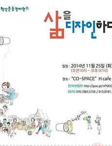 《사회혁신운동컨퍼런스-"삶을 디자인하다" 》 ◎ 일시: 11월 25일(화) 10:00~19:00◎ 장소: CO-SPACE H Cafe 함께 (대전유성구 덕명동 142-14)◎ 내용:1. 토크콘서트: 사회혁신운동을 상상하라.2. 섹션&워크샵: 소셜디자인을 배우다.3. 대토론회 및 네트워킹 ◎ 접수방법: 아래 링크를 통해 접수 (참가비: 10,000원)http://goo.gl/mPQOG8 ■ 주최: 사회혁신운동컨퍼런스 조직위원회■ 주관: 사회혁신운동컨퍼런스 기획위원,(사)풀뿌리사람들■ 조직위원회: 대전마을기업연합회, 대전발전연구원, 대전사회적기업협의회, 대전생협, 대전시민단체연대회의, 대전시민사회연구소, 대전여성단체연합, 디트뉴스, 마을교육연구소, 목원대학교행정학과, 민주노총대전지역본부, 복사꽃사람들, 시민..