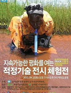 유엔 세계평화의 날(매년 9월 21일)을 기념하여 9월 22일에 "지속가능한 평화를 여는 적정기술 전시 체험전"을 여의도공원에서 열게 되었습니다! 책으로만 보던 여러 적정기술 제품들을 직접 보고 만져 볼 수 있는 이번 기회를 놓치지 마세요! :) -일시: 2012.09.22(토) 오전 11시~오후 5시 -장소: 여의도공원 -주최: 2012 유엔세계평화의날 한국조직위원회 -주관: 적정기술미래포럼, 글로컬 그린네트워크 -협력: 한밭대학교 적정기술연구소, 코페르닉코리아, 유엔과국제활동정보센터, 에딧더월드, 세계자연보호기금(WWF) Earth Hour 한국 사무소, 국제엠네스티 인권생각 '옴', 넛지플러스 후원: 외교통상부, SBS, 중앙일보, C&U, (사)에이드그린