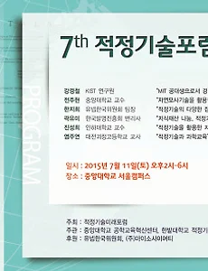 적정기술포럼57 제7회 적정기술포럼 - "MIT 공대생으로서 경험한 적정기술: T자형 인재가 만드는 O자형 기술" (강경철) ■ 일시: 2015년 7월 11일(토) 오후 2시~6시■ 장소: 서울 중앙대학교 102동 314호 약학대학 대강당 ■ 주최: 적정기술미래포럼■ 주관: 중앙대학교 공학교육혁신센터, 한밭대학교 적정기술연구소■ 후원: 유넵한국위원회, 마이소사이어티 * "MIT 공대생으로서 경험한 적정기술: T자형 인재가 만드는 O자형 기술" - 강경철(KIST) 2015. 10. 15. 제7회 적정기술포럼 - 자료집 ■ 일시: 2015년 7월 11일(토) 오후 2시~6시■ 장소: 서울 중앙대학교 102동 314호 약학대학 대강당 ■ 주최: 적정기술미래포럼■ 주관: 중앙대학교 공학교육혁신센터, 한밭대학교 적정기술연구소■ 후원: 유넵한국위원회, 마이소사이어티 2015. 7. 30. <제7회 적정기술포럼>에 여러분을 초대합니다! (사전등록 마감-당일 선착순 현장등록 가능) 안녕하세요. 적정기술포럼에 관심을 가지고 적극적으로 참여해 주시는 여러분들께 감사 드립니다. 이번 적정기술포럼은 첨단기술에 집중하는 상위 10%를 위한 기술보다 새로운 생산성을 만들어내는 소외된 90%를 위한 기술에 집중하는 적정기술미래포럼이 주최합니다. 현재 적정기술미래포럼은 적정기술 플랫폼으로서 일반인 대상 적정기술 아카데미를 운영하고 있습니다. + 일시: 2015년 7월 11일(토) 오후 2시~6시 + 장소: 서울 중앙대학교 102동 314호 약학대학 대강당 Main Session - 강경철(KIST 연구원) - 전주현(중앙대학교 교수) - 한지희(유넵한국위원회 팀장) - 곽유미(한국발명진흥회 변리사) - 진성희(인하대학교 교수) - 염주연(대전괴정고등학교 교사) + 주최: 적정기술미래포럼 + 주관.. 2015. 6. 6. 제6회 적정기술포럼 - "개도국의 폐비닐과 플라스틱 재생을 위한 적정기술 개발" (이경황) ■ 일시: 2014년 7월 12일(토) 오후 2시~5시■ 장소: 서울 연세대학교 제2공학관 B040호 ■ 주최: 적정기술미래포럼■ 주관: 연세대학교 공학교육연구센터, 한밭대학교 적정기술연구소 * "개도국의 폐비닐과 플라스틱 재생을 위한 적정기술 개발" - 이경황(OHFA Tech 대표) 2014. 9. 9. 이전 1 2 3 4 5 6 7 ··· 15 다음