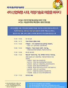 제1회 충남적정기술포럼 - 4차 산업혁명 시대, 적정기술로 마을을 바꾸다. 4차 산업혁명 시대, 지역 사회의 토대인 마을을 지속가능성장의 원천으로 바꾸고자 +3T(적정기술, 사회기술, 마을기술의 융합)의 의미와 역할을 논의하고, 충남의 사회, 경제, 교육, 문화 등 영역에 접목하여 지역산업화 방안을 모색합니다. ○ 일시: 2017년 6월 2일 금요일 14:00-17:30○ 장소: 국립공주대학교 예산캠퍼스 (본관 컨벤션홀) ■ 주최: 충남지속가능발전협의회, 충남녹색성장포럼■ 주관: 충남적정기술연합회, 국립공주대학교 산업과학대학, 마이소사이어티■ 후원: 한국사회적경제연구회, 적정기술미래포럼, 충남연구원, 충남사회경제네트워크